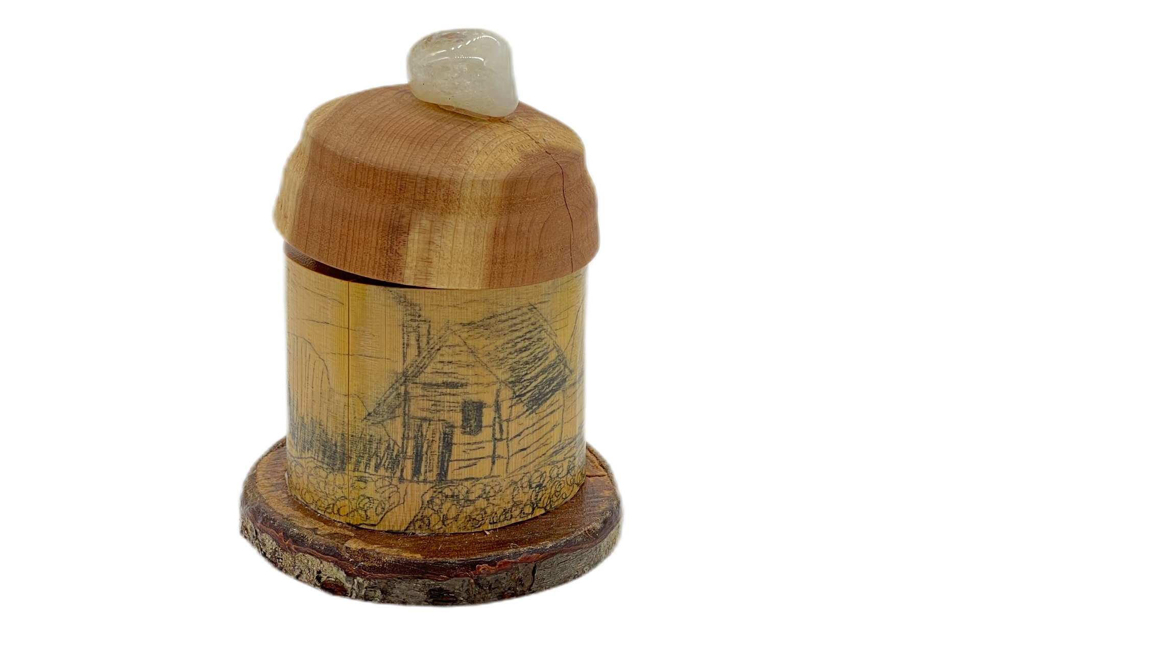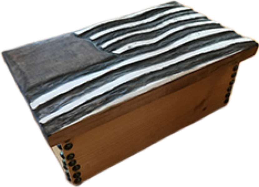 Shaped box made of individual cedar strips attached to spalted maple ends. Carved