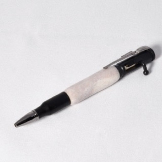 These pens are made to look like a bullet and the pen retractor is made to emulate the action of a riffle. The finishes are either 24 Kt gold or chrome and enamel. Specifically chosen materials such as deer antler and highly coveted woods due to their beauty are use to help accent the metal parts. A look a like bullet primer is at the end of the pen as well as a bullet look alike tip. A riffle gun clip is used.