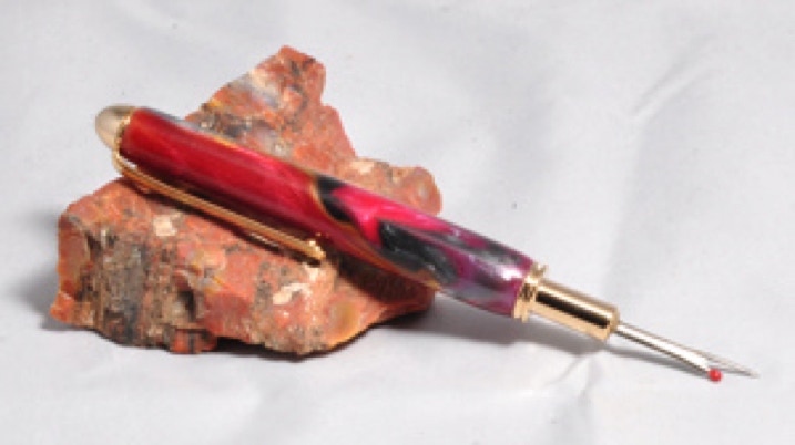Using a two part polyester resins and two Pearl Ex colors, one with red Pearl Ex and another with gold Pearl Ex. and a touch of green (Pearl Ex Powdered Pigments create a metallic look). The two mixtures were added together creating swirls and cosmic like designs. It was then poured into a mold, hardened and milled smooth on a lathe.