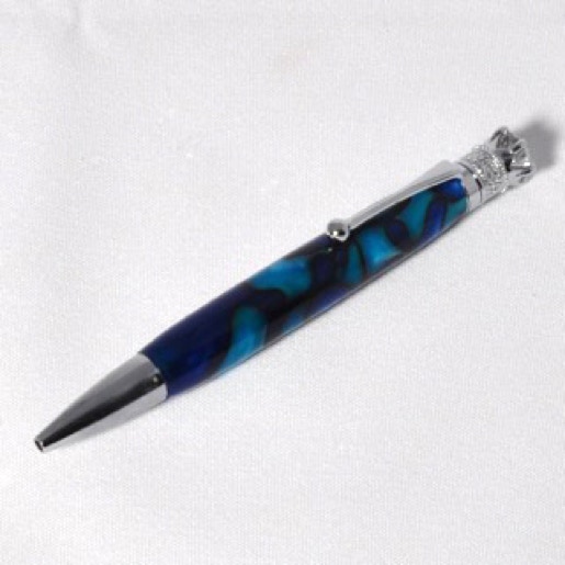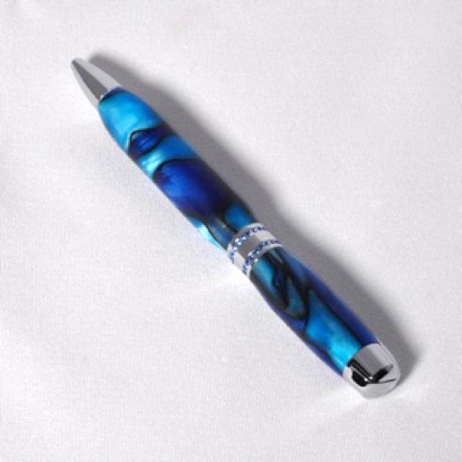 Milled from a blue turquoise shimmering acrylic this pen is highly polished and smooth to the touch. A large Swarovski crystal adorns the top and is used for the twist to retract the pen mechanism.