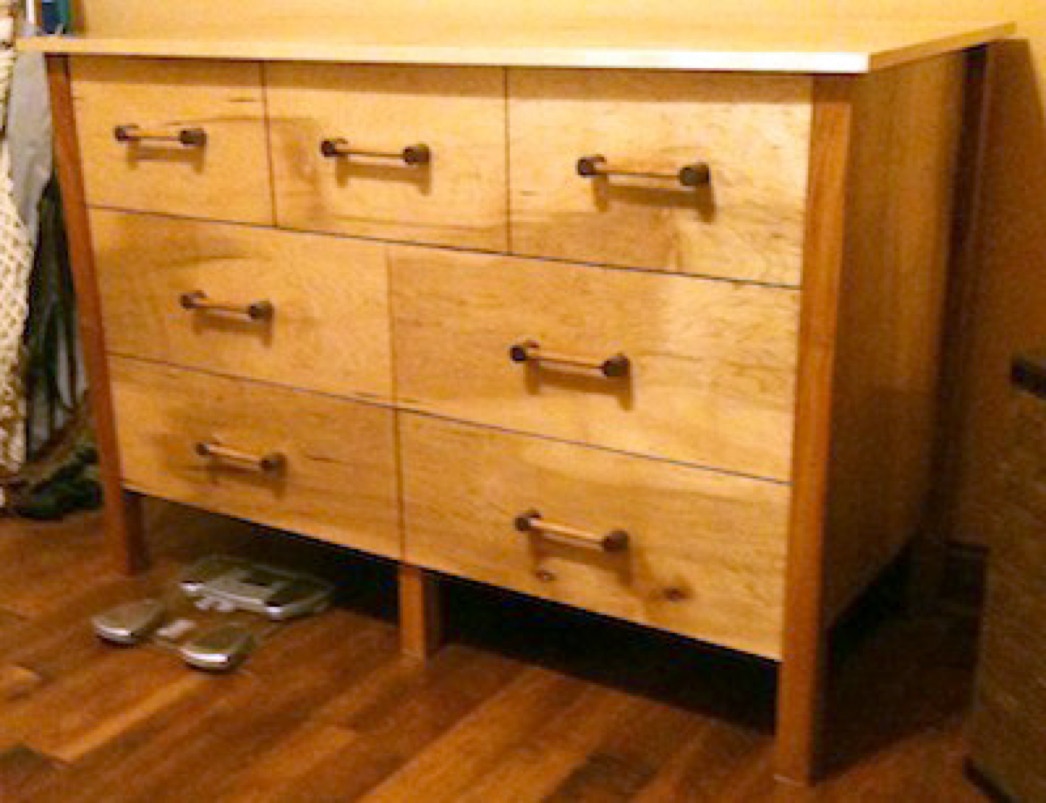 This Birch dresser has drawers that are 8" deep and handles that are made of Cherry and Walnut woods.