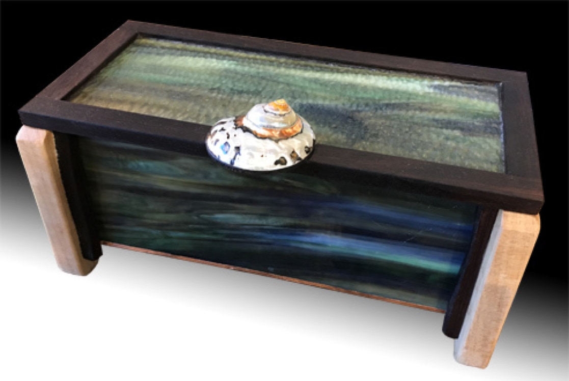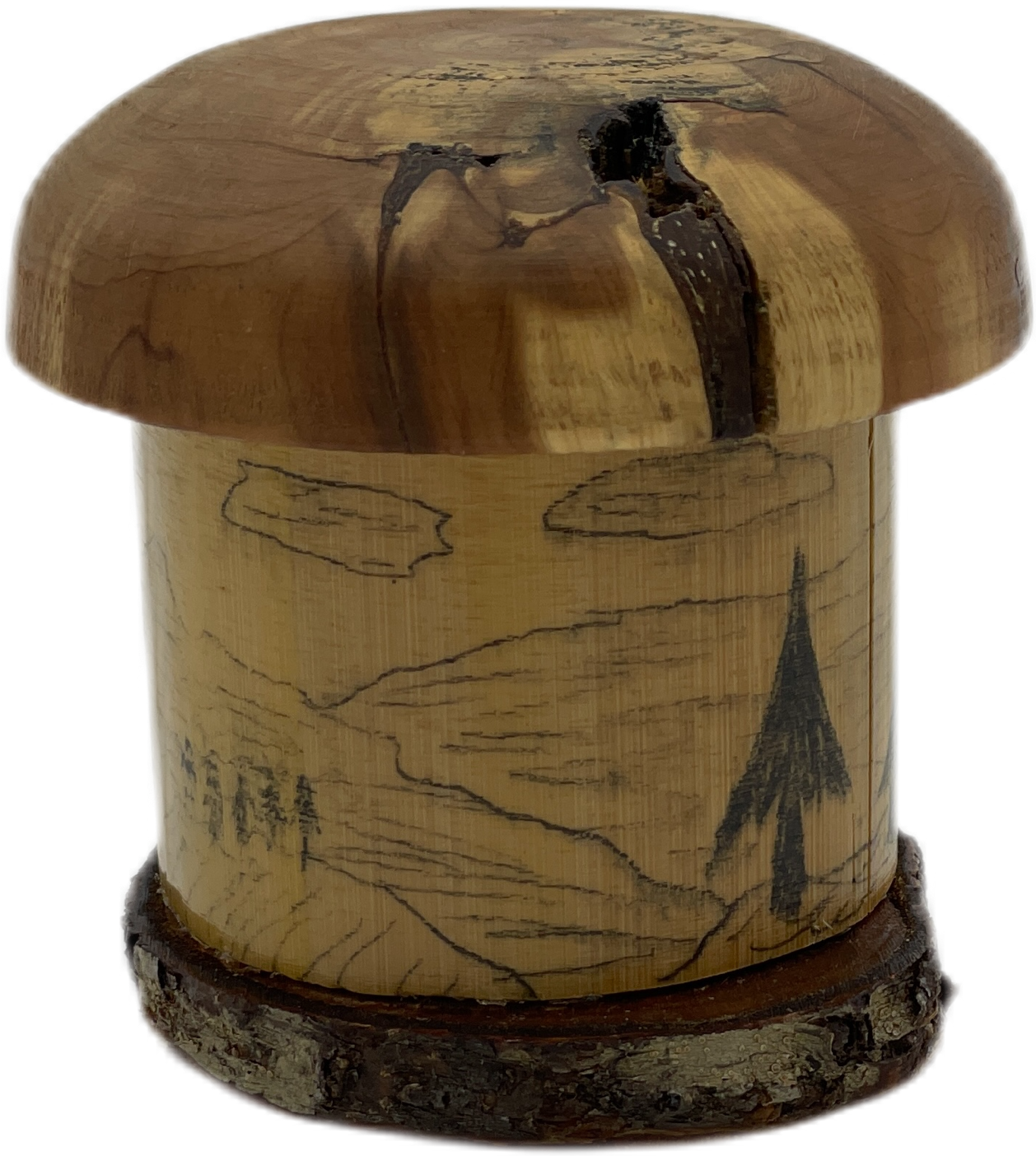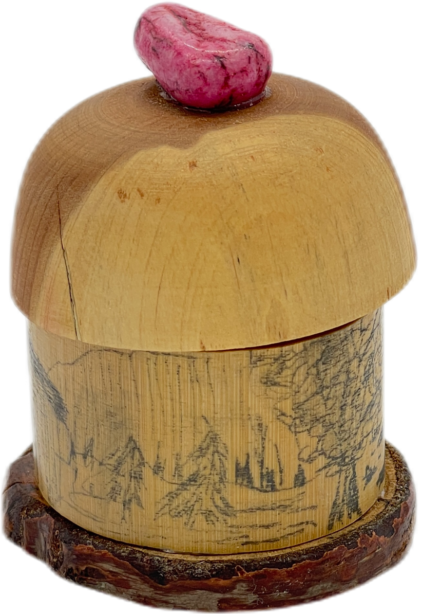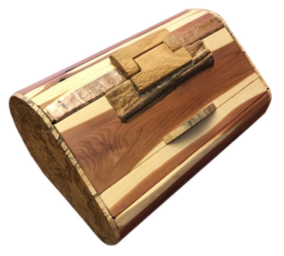 Shaped box made of individual cedar strips attached to spalted maple ends. Carved