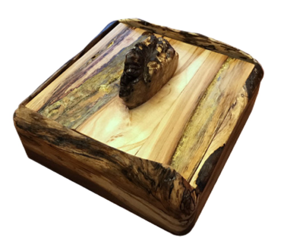 The log was carefully milled and the center removed. The milled pieces were then assembled to create this box. In the end, the pieces of wood are in the same location as in the original log.