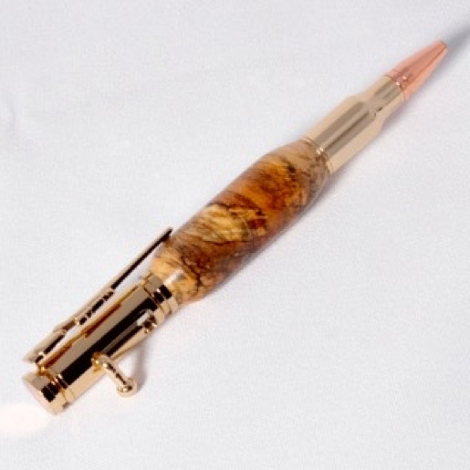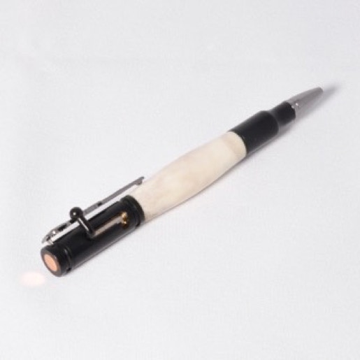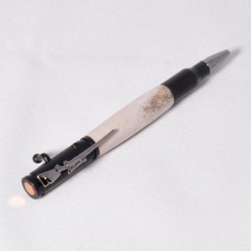 These pens are made to look like a bullet and the pen retractor is made to emulate the action of a riffle. The finishes are either 24 Kt gold or chrome and enamel. Specifically chosen materials such as deer antler and highly coveted woods due to their beauty are use to help accent the metal parts. A look a like bullet primer is at the end of the pen as well as a bullet look alike tip. A riffle gun clip is used.