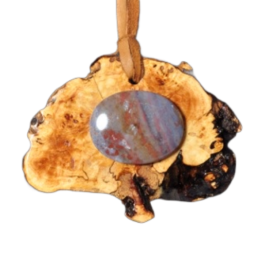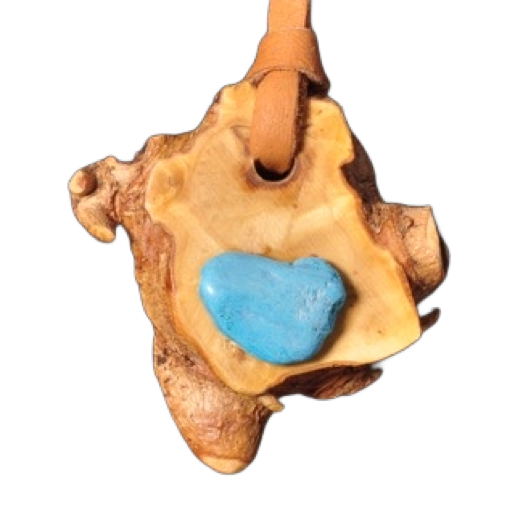 This Necklace is made from a crepe myrtle knot. When this tree is trimmed, the areas where the smaller branches are removed are full of figure from the mulitple branches that sprout out from the main limb. Fully textured and beautiful with live edge. It is approximately 2" round and attached with a brown leather lanyard. The light turquoise stone is a nice accent for the light brown colored wood.