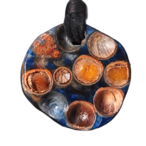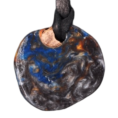 Blue, copper, silver acyrlic mixed with seeds. Approximately 1" round with black leather lanyard. Highly polished to a smooth finish.