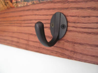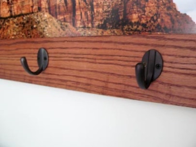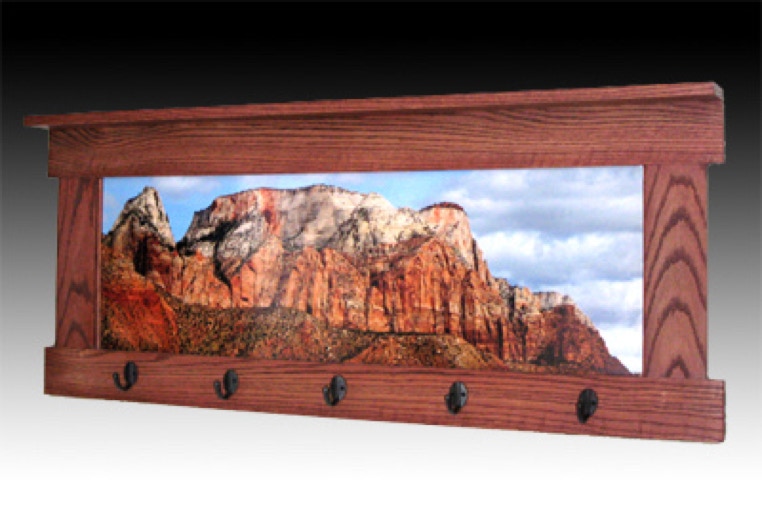 The image was taken at Zion National Park. The Mission style clothes rack was put together using a biscuit joiner. There are no miter corners. A shelf adorns the top of the frame to hold your showpieces. Five Mission style clothing hooks were attached to the bottom of the frame.