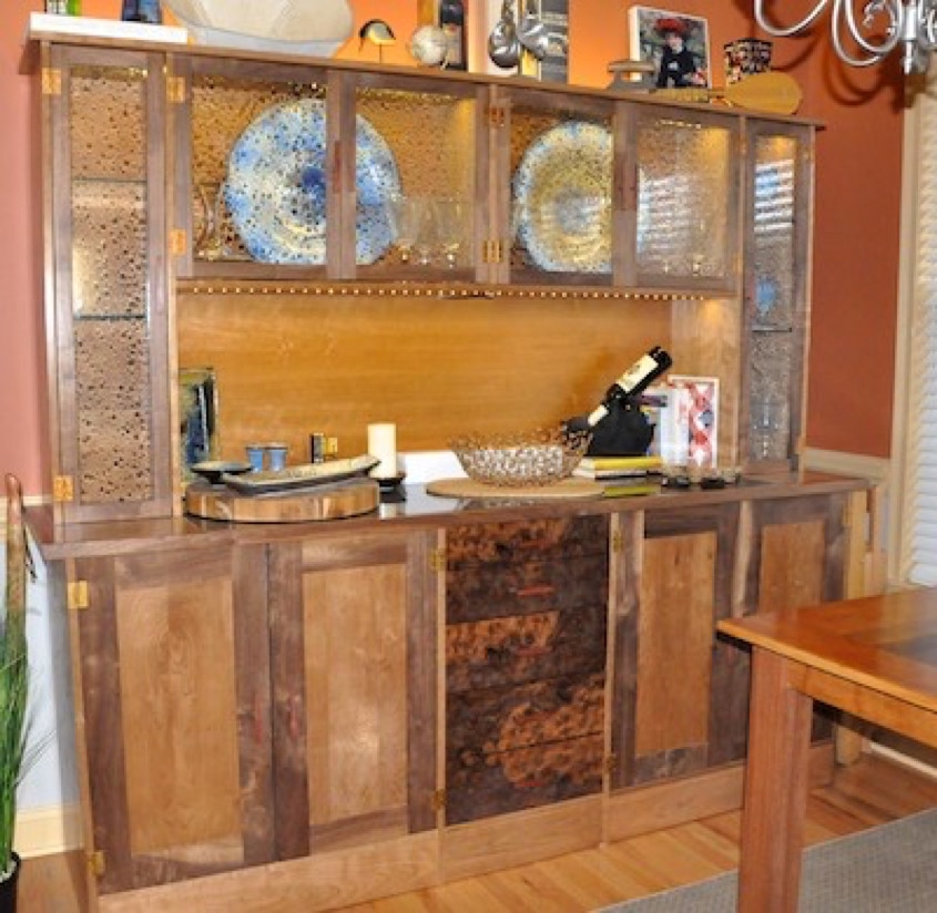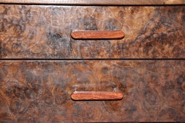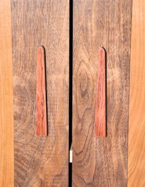 The hardware is Bubinga (an exotic African wood). They are attached to the doors and drawers using walnut dowels. Each hinge is brass. They were hand painted to tone down its bright value and add a patina look and feel.