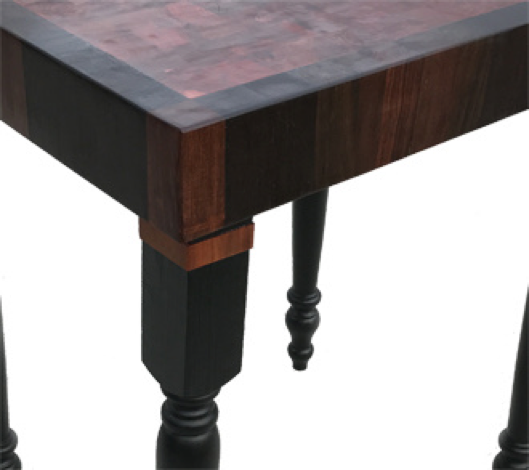 Using Padauk (red center) and other exotic hardwoods to frame the table such as Cocobolo, Ebony, and Mahogony this butcher block table stands 36" tall and is approximately 24" square. The legs are painted black
