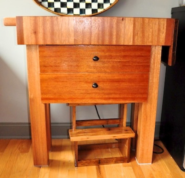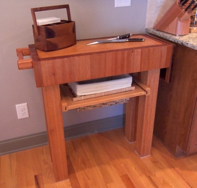 The interior of this butcher block is made of European maple. The outside is wrapped with 2" square by 6" long mahogany sections. At one end there is a mahogany towel rack and at the other end there is a walnut knife sheath. The legs are mahogany.